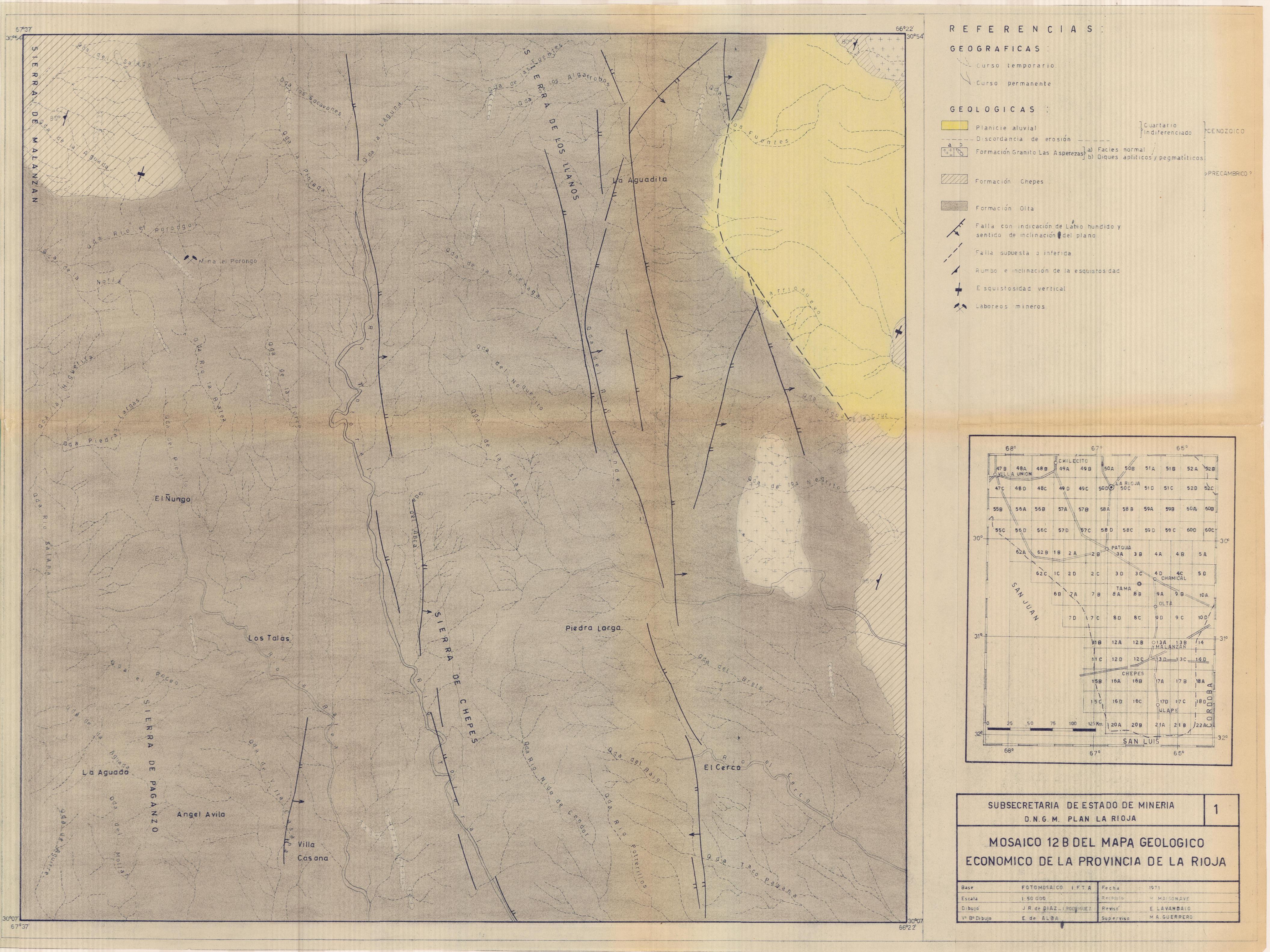 Argentina. Dirección Nacional de Geología y Minería. Plan La Rioja, 1972. Descripción del mosaico 12B del mapa geológico económico de la provincia de La Rioja. 35 pp. La Rioja, Dirección Nacional de Geología y Minería. Plan La Rioja (ex Delegación Plan Cordillera Norte)
