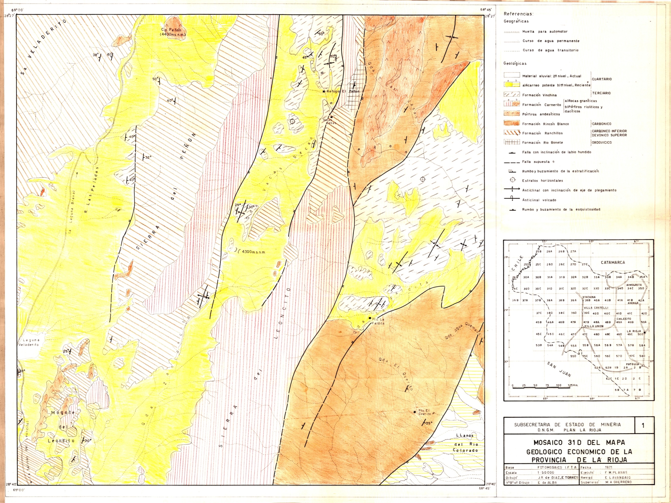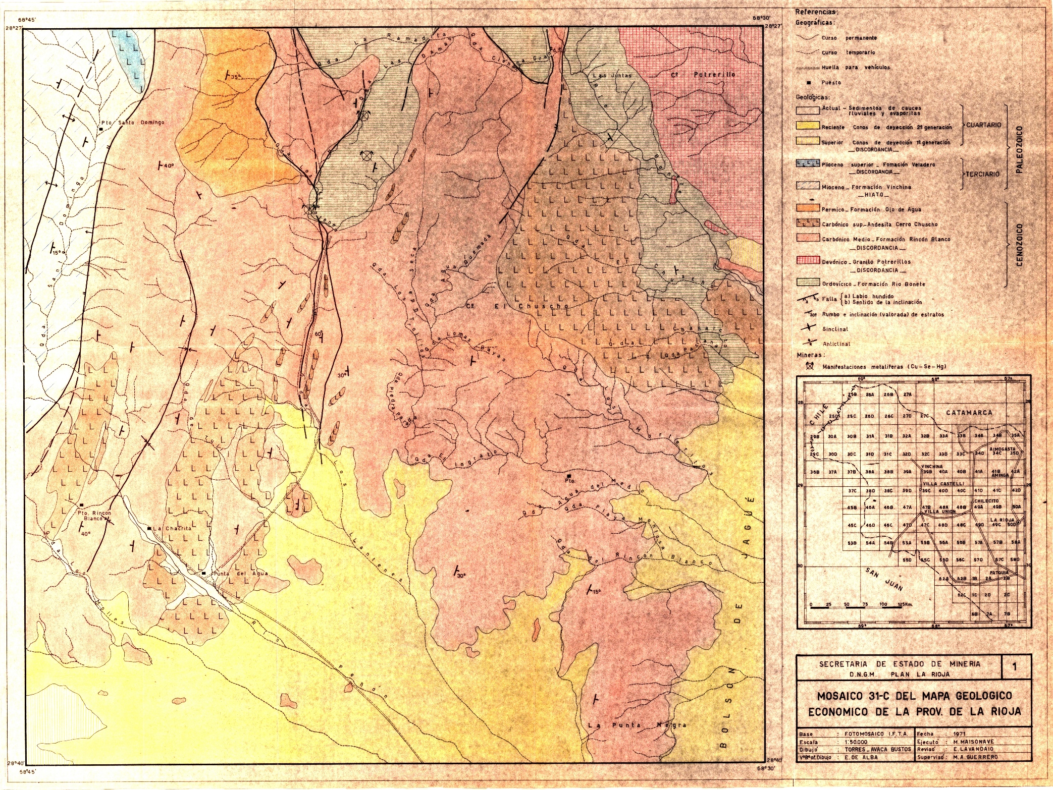 Fil: Maisonave, Héctor Mario. 1971. Descripción de los Mosaicos 31C del mapa geológico económico de la provincia de La Rioja. 24 pp. Ministerio de Economía. Secretaría de Minería. Dirección Nacional de Geología y Minería; Argentina.