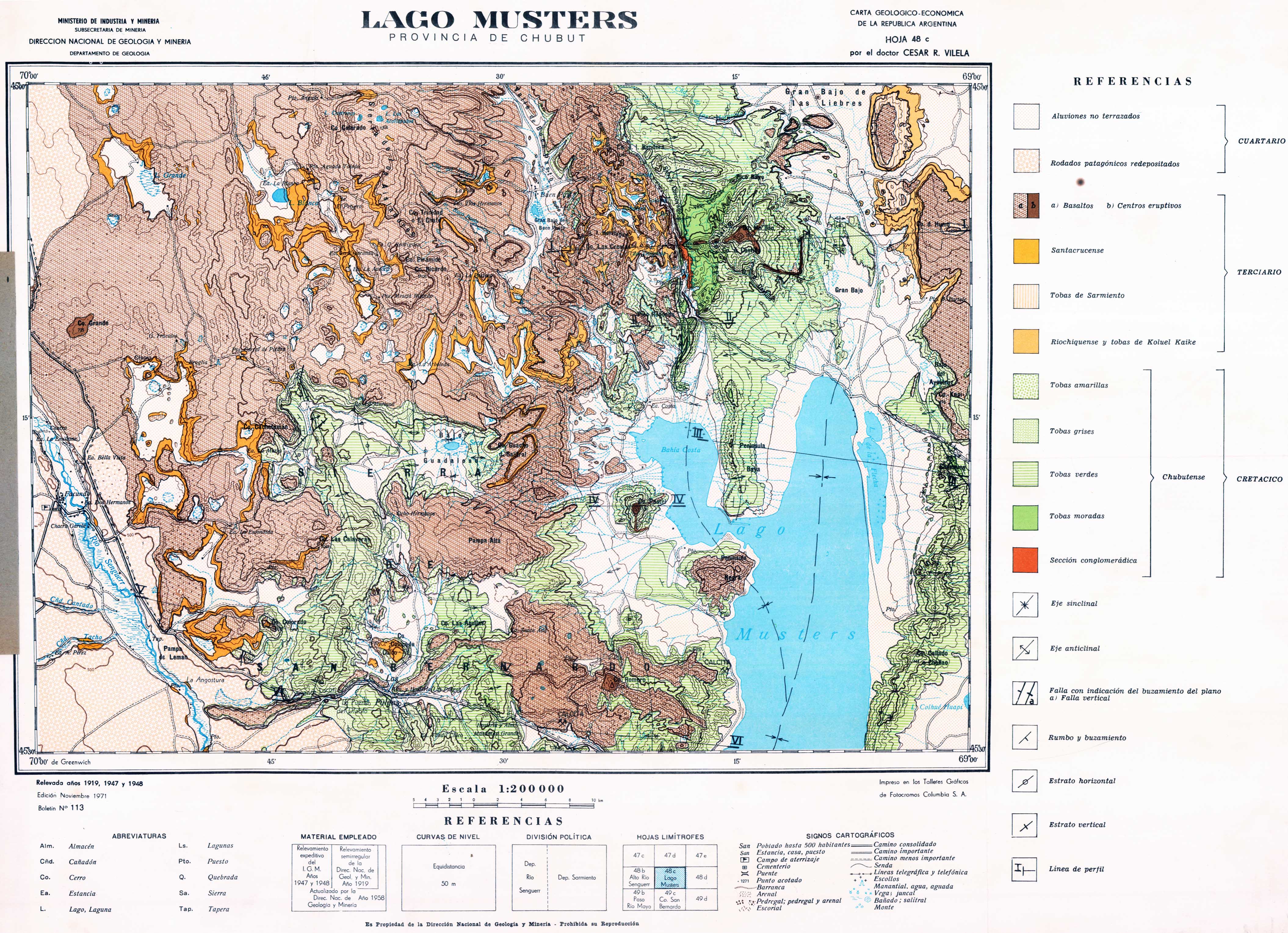 VILELA, C.R., 1971. Descripción Geológica de la Hoja 48 c, Lago Musters. Provincia del Chubut. Escala 1:200.000. Carta Geológico-Económica de la República Argentina. Boletín 113, 85 p. Buenos Aires, Servicio Nacional Minero Geológico